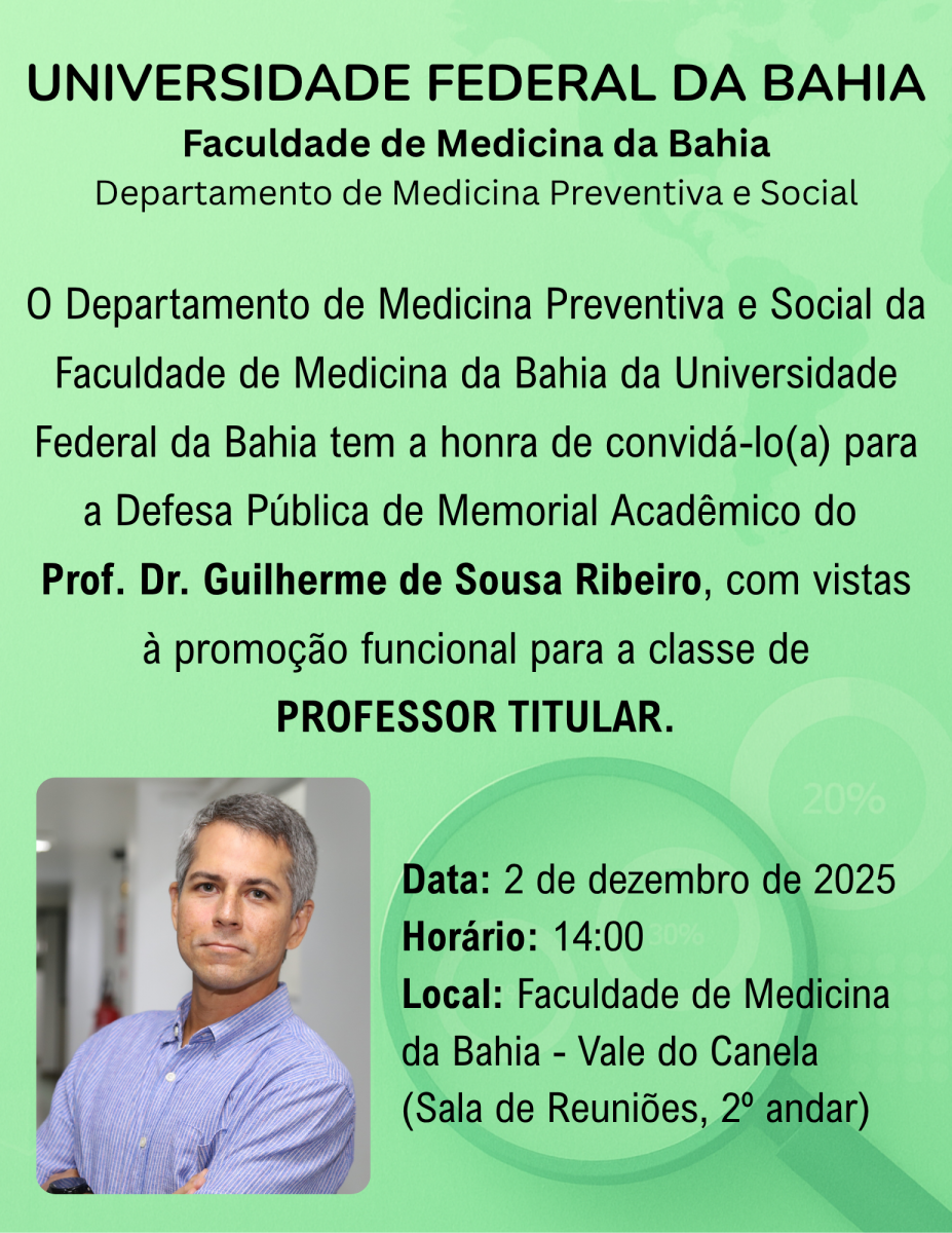 O Departamento de Medicina Preventiva e Socia da Faculdade de Medicina da Bahia da Universidade Federal da Bahia convida a Comunidade para a Sessão Pública de Defesa de Memorial Acadêmico do Prof. Dr. Guilherme de Sousa Ribeiro, como requisito para sua promoção a Titular. A Sessão acontecerá no dia 02 de dezembro de 2025, a partir das 14h, na Faculdade de Medicina da Bahia, Vale do Canela, Sala de Reuniões - 2º Andar.
